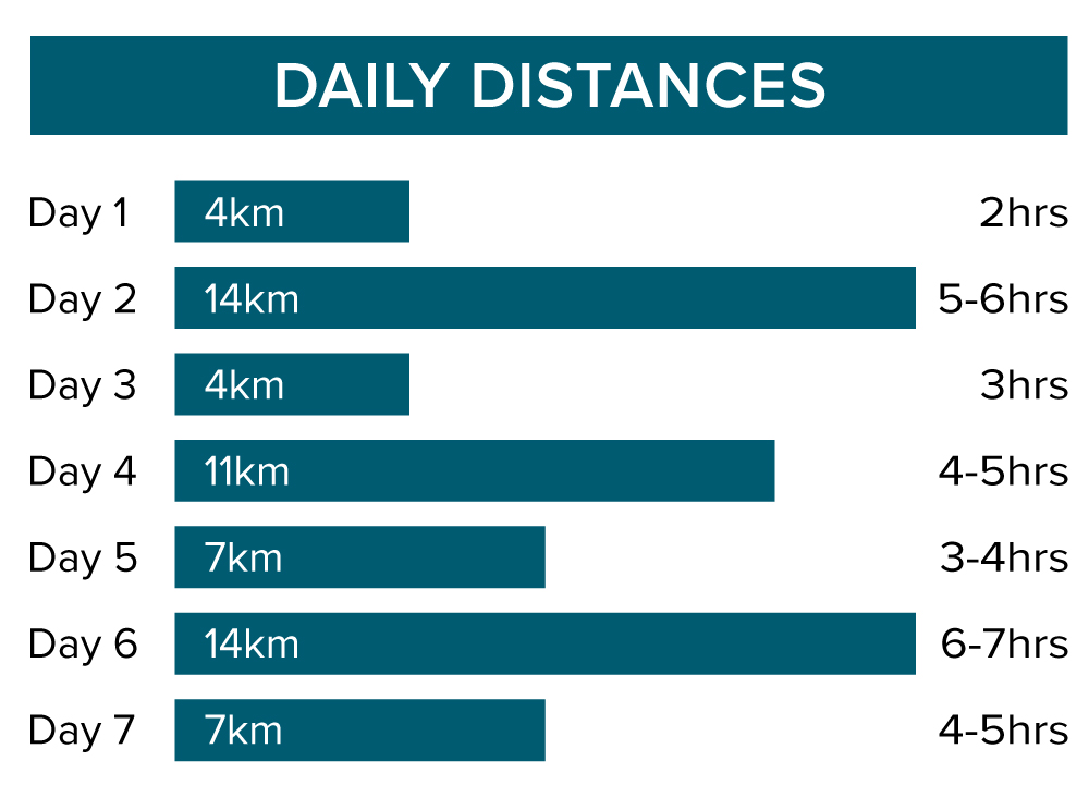 Today's shorter walk will take approximately three to four hours and will cover a distance of 7 kilometres/4.4 miles, mostly on marked trails, with a total ascent and descent of 680 metres/2,231 feet.