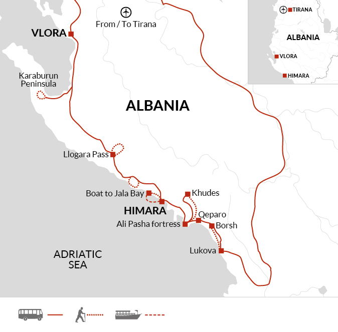 Our trip officially begins at 8pm in the arrivals hall of Tirana Airport (TIA). Please look out for your tour leader, who will be waiting just outside the arrivals area near the Vodafone stand, holding an Explore signboard. To ensure you have enough time to clear immigration and collect your bags, your flight should arrive no later than 7.30pm. From the airport, we'll travel together to Vlora - a journey of approximately 150 kilometres, which should take around two-and-a-half hours.