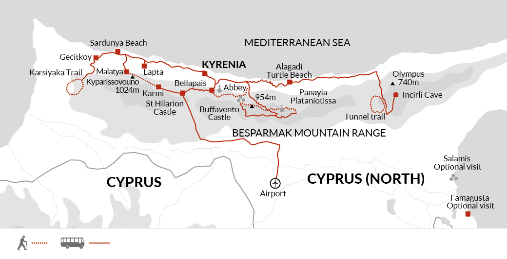 This mornings walk is a easy going scenic 6.5km / 4 mile trail starting in Karmi Village, passing through the peaceful village of Ilgaz (also known as Ftericha), where we'll make a stop at the Gillham Vineyard, a Cypriot wine producer. We'll break for lunch along the way before continuing the walk to Malatya, where we re-join the bus for the short journey to Kyrenia town.