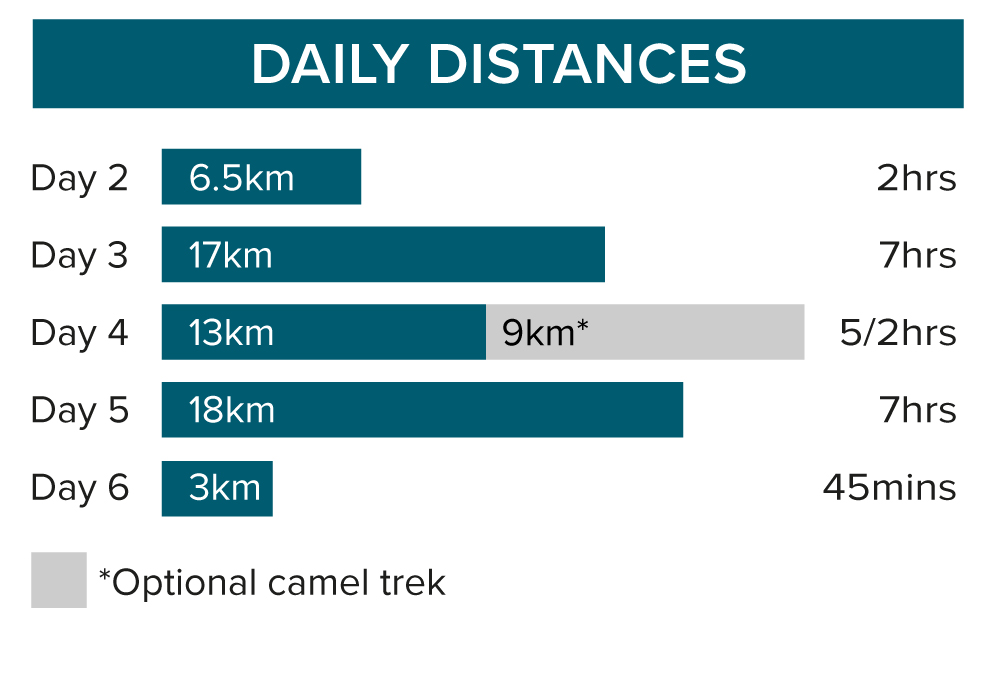 We'll continue our walk to our campsite, just as the sun begins to set. Our comfortable camp is exclusive to the Explore group and we'll share a large communal tent (with gendered compartments). There's a shared washroom with toilets and showers. You can upgrade to a private tent at no extra cost, subject to availability. Please speak to your leader about arranging one.