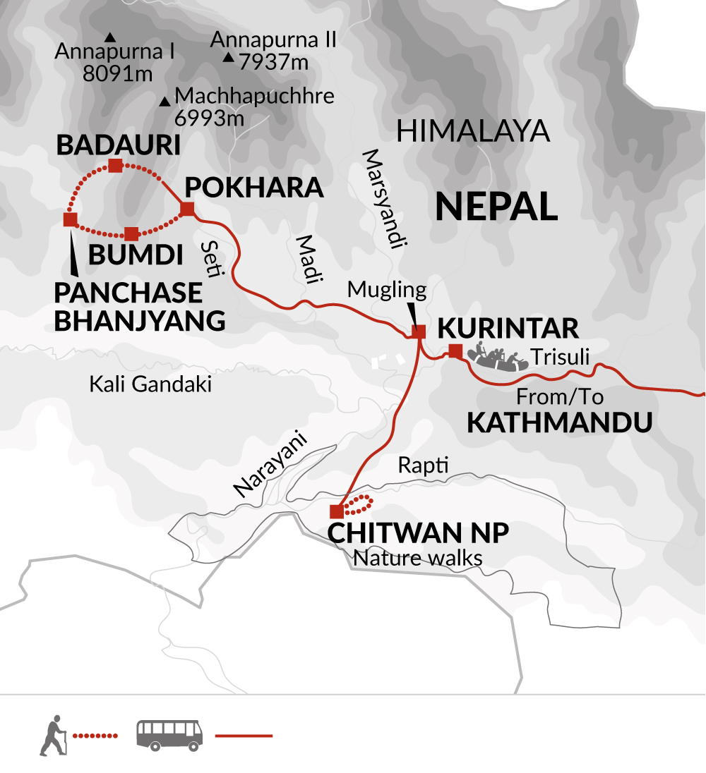 En route, you'll have the option to partake in an exciting half-day whitewater rafting trip on the Trisuli River (Grade III-III+). No previous experience is required (although we do recommend that you are confident swimming for at least 25 metres/82 feet unaided) and the price includes all permits, equipment, the services of experienced river guides and lunch.