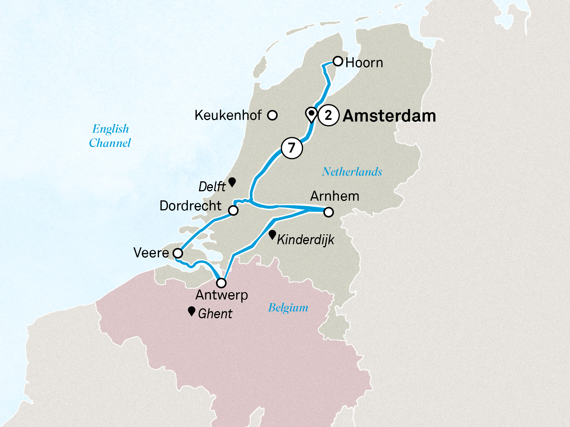 See the very best of The Netherlands and Belgium on this eight-day journey that cruises round trip from Amsterdam. Visiting the pretty village of Veere, thriving modern centres like Antwerp, and Arnhem, famous for its eponymous battle, you’ll experience the culture and traditions of these fascinating countries. Explore Keukenhof, one of Europe’s largest and most beautiful gardens, bursting with thousands of colourful tulips laid out in meticulous patterns. Taste traditional Dutch cheeses, spot windmills along the riverbanks, eat oysters fresh from the North Sea and admire the elaborate décor of Palais Het Loo. You’ll also enjoy after-hours access to the spectacular Fabrique des Lumières digital art installation. Extend your cruise with an additional three-day stay in Amsterdam to discover more of the Netherlands’ World Heritage-listed capital. Luxury accommodation, included transfers and a Scenic Tour Director make for seamless travel.
