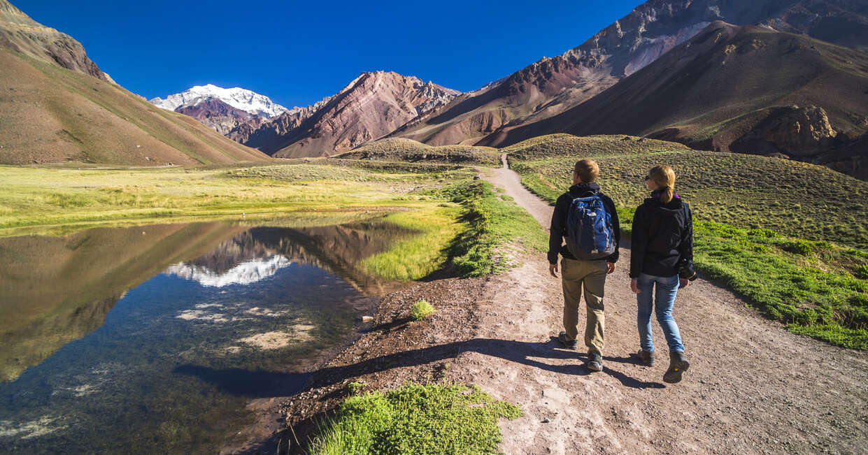 Today we have a full-day trip to Aconcagua Provincial Park, home to the magnificent Aconcagua - standing at 6,961 metres/22,837 feet it's the tallest peak in the Americas. At the bottom of the permanently snow-covered peaks, we'll find lush meadows and some forested valleys, and our tour leader will take us on a 90-minute hike to the Horcones Lagoon, a glacier-fed lagoon with outstanding views of the mountains. The trail is relatively flat and rocky, with mountains at either side of us and the peak of Aconcagua rising before us in the distance. Before returning to Mendoza, we'll also make a stop at the Puente del Inca, a geologically formed bridge once allegedly used by Incas to cross the river. The reddish oranges of the formation are caused by the minerals in the waters running beneath the bridge, and the remains of a slightly curious-looking stone chapel are still found built into the rock.