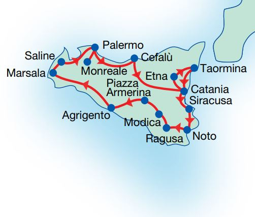 - Visits of Monreale, Palermo, Agrigento, Piazza Armerina, Ragusa, Siracusa, Noto, Etna, Taormina, Catania old town centre, Cefalù