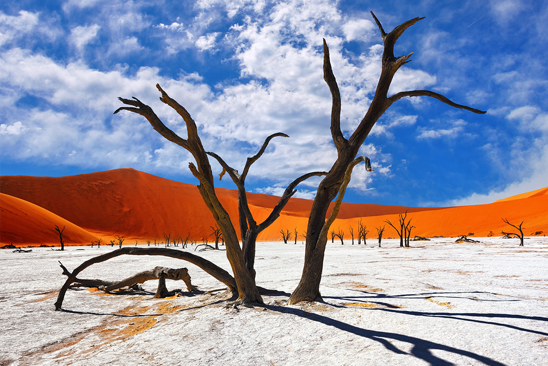 Drive to Sesriem, your base for exploring the incredible Namib Desert region. The most famous part of the Namib Desert is its vast dune fields, the most spectacular of which are found near the Sesriem Canyon. This canyon was formed when the Tsauchab River carved a gorge 30 metres into the gravel deposits about 15 million years ago. Now, the river flows out to the dune fields that stretch for hundreds of miles up the coast and dries up in a clay pan at Sossusvlei. The dunes – the highest in the world – are stunning, with magnificent flaming tones created by the brightly coloured sands.